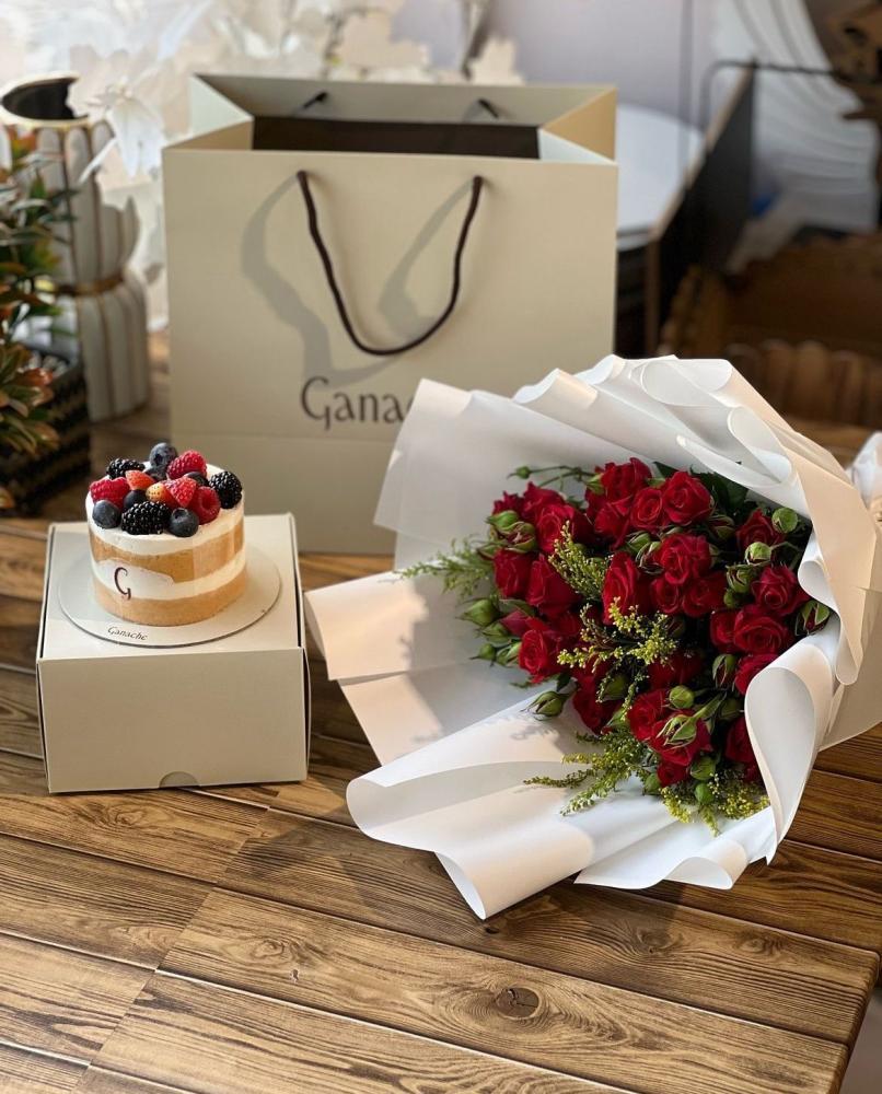 باقة ورد أنيقة مع كيكة جاناش فاخرة تعطي شعور بالكرم والاحتفال بنفس الوقت.
